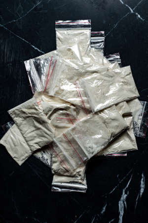white powder (heroin, cocaine, narcotic) in a plastic bag on a black background, drugs are scattered in the form of a track