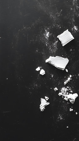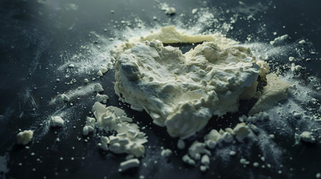 Artistic black and white image showcasing a fine white powder spread artistically across a dark surface, creating an intriguing contrast and texture.