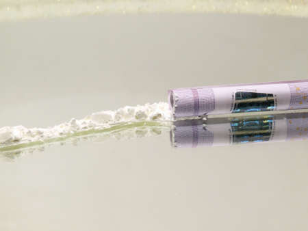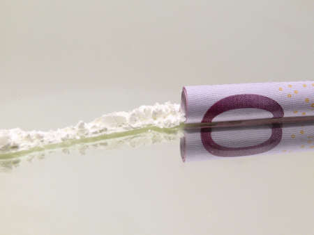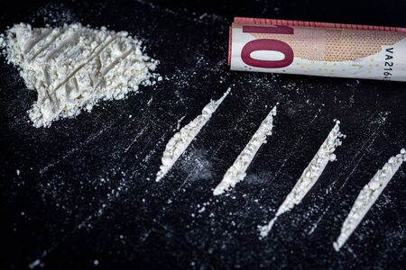 cocaine or speed in a line. addict with euro bill for snorting, drug abuse concept close-up