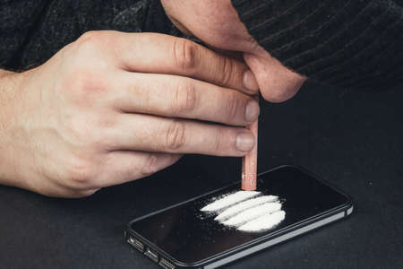 Close-up of drug addict snorting a cocaine stripe over the smart phone