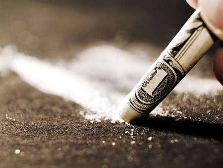 Junkie is snorting cocaine powder with rolled banknote. Narcotics concept.