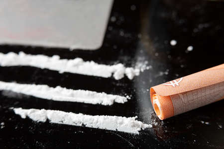 Cocaine lines prepared on a table and a rolled banknote ready to be sniffed