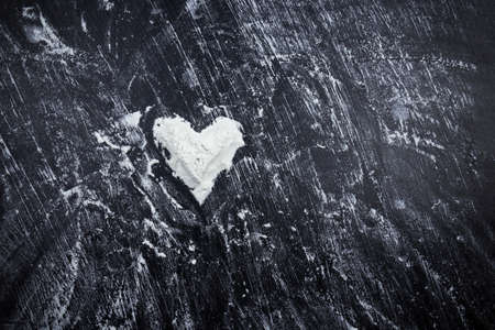 Scattered white flour with heart shape on black surface.