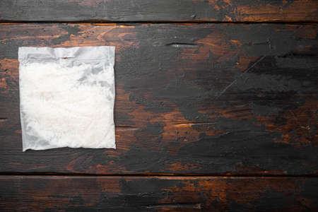 Quick cooking rice bag set, on old dark wooden table background, top view flat lay, with copy space for text