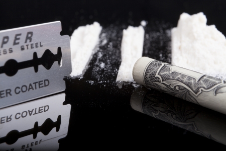 Drug rows with a dollar and razor blade on dark background with reflection