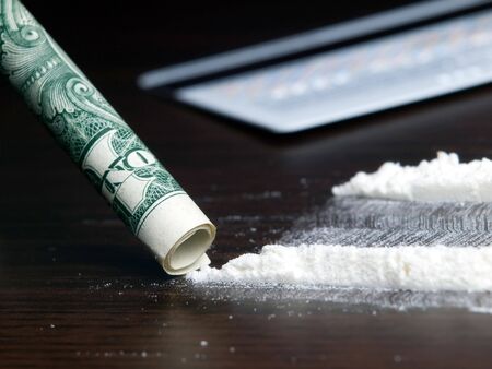 close-up of a hundred-dollar bill rolled into a tube above a line of white powder. The concept of bad habits, drug use, illegal substances that lead to death. Selective Focus