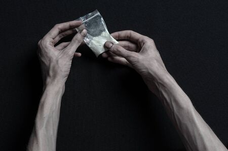 Mans hand holds plastic packet with cocaine powder or another drugs. Drug dealer selling drugs junkie. Toned photo