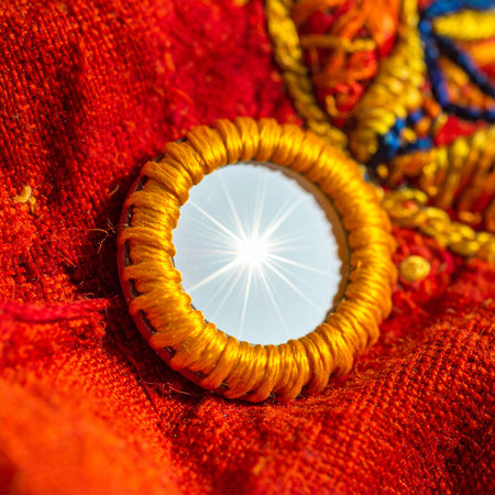 A close-up captures the intricate detail of traditional Indian shisha embroidery.