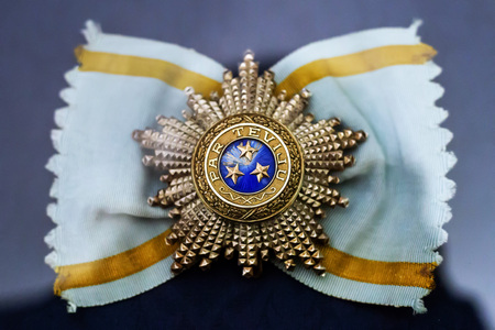 Against a dark background Soviet award Patriotic war of the first degree.Date: 18.04.2018 years. Editorial image.Close up. Indoors. Vignette. Horizontal format. Color. Photo.