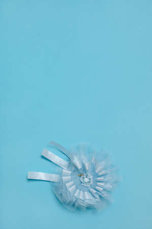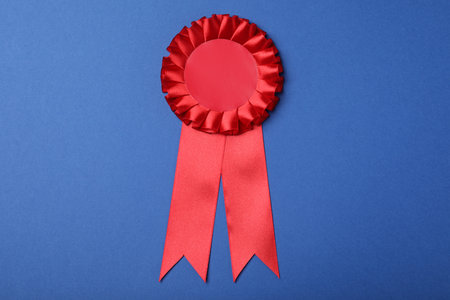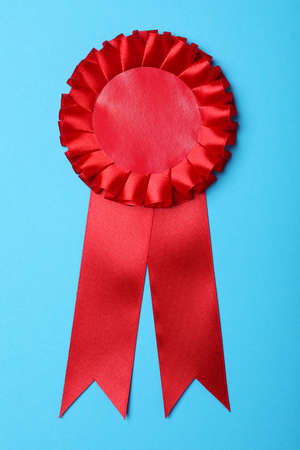 A vibrant red ribbon award displayed against a soft blue background, representing achievement and recognition for various accomplishments and events.