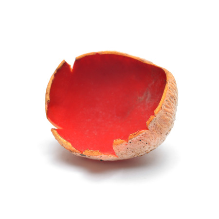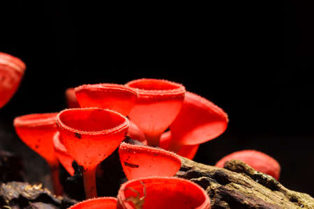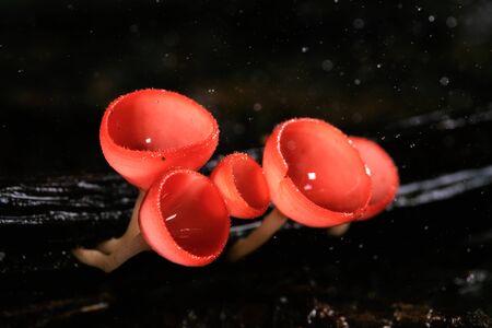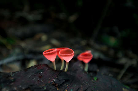 Champagne mushrooms have a beautiful red or orange cup shape in the rainforest.