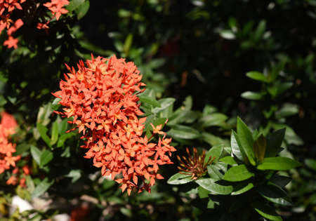 Beautiful Red spike flower. King Ixora blooming (Ixora chinensis). Rubiaceae flower.Ixora flower. Ixora coccinea flower in the garden