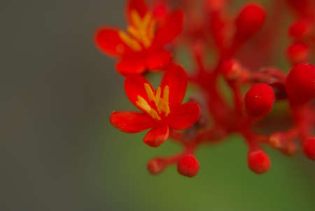 Jatropha flowers and green leaves. Blooming shrub with small red flowers. Background with exotic plant