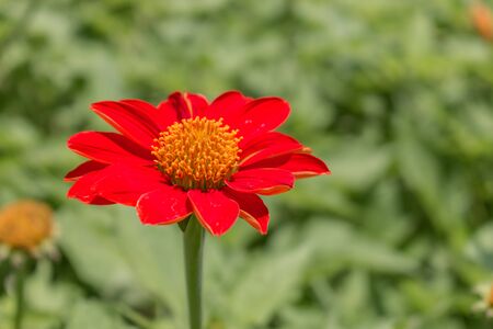 Red flower in garden. Flower in summer. Inflorescence on green background.