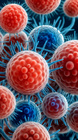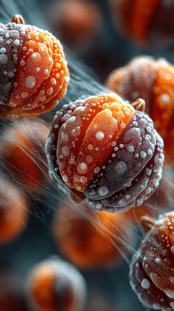 This image presents an abstract illustration featuring numerous spherical structures. They exhibit vibrant orange and red hues. The composition suggests an organic environment. The artwork incorporates a dark background, creating a visual contrast. Suitable for educational, scientific, or conceptual projects, it may be utilized in various commercial or editorial contexts.