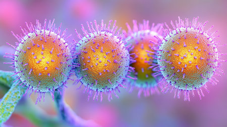 Intricate microscopic view showcases a variety of viruses and bacteria, highlighted by bright colors and intricate details, offering a fascinating glimpse into microbial life.