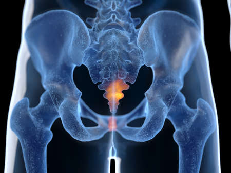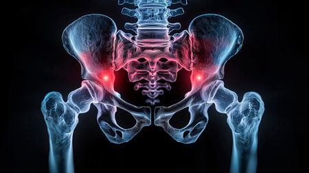 Detailed translucent rendering of human pelvic bones lower spine and hip joints concentrated area of bright red glowing pain