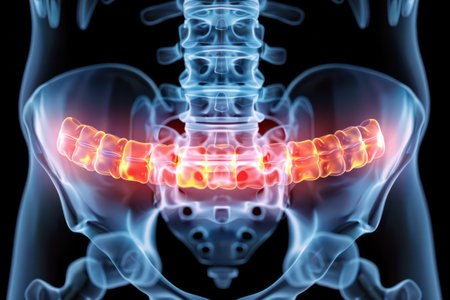 Detailed representation of the spinal column and pelvis, focusing on pain indicators in the lower back area, useful for educational and medical purposes.