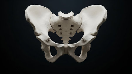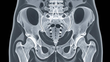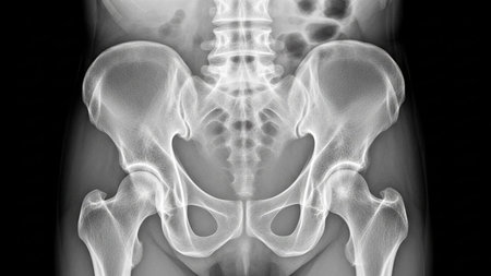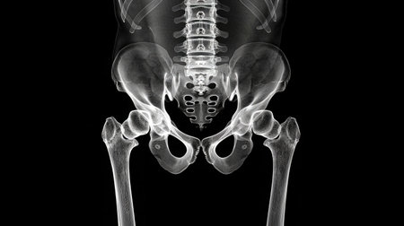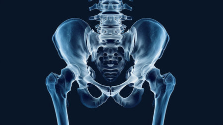 High-resolution X-ray image of a human pelvis and hip bones. Concept of medical imaging, skeletal anatomy, diagnostic tool, healthcare illustration.