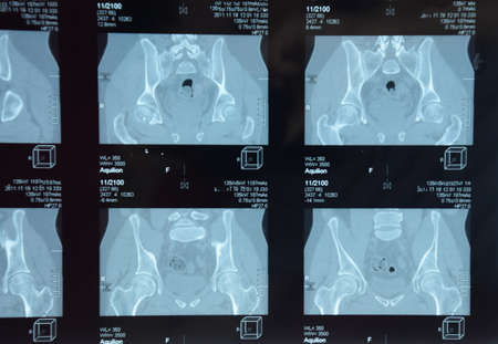 X-ray of the pelvic bones of a man. A doctor radiologist is studying an x-ray examination. A hip joint is placed on the patient’s body