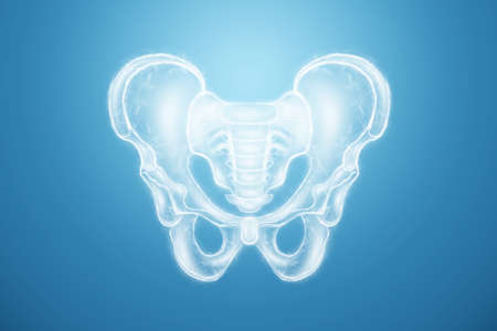 Hologram, ultrasound image, anterior view of the male pelvis, sacrum isolated on a blue background. Anatomy, medicine, scientific concepts. 3D rendering, 3D illustration