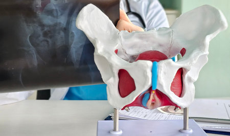 A medical professional holding a model of the human pelvis, explaining the structure and function of the pelvic bones to a patient.