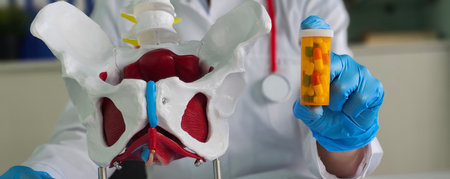 Model of female pelvis with pills in the hands of gynecologist. Treatment of inflammatory diseases of the pelvic organs in women