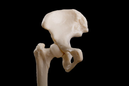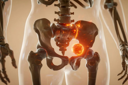 Human skeleton showing hip joint pain, highlighting potential arthritis or injury in a medical visualization, emphasizing anatomical detail and health concerns.