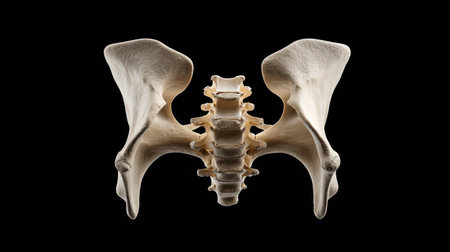 The stylized human spine and pelvis are rendered in warm light against a black background, allowing for a clear view of the anatomical structures.