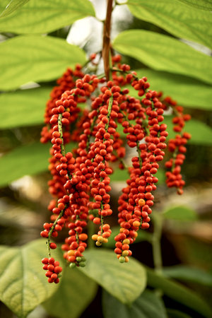 Young green fruits of black pepper grow on a bush in the garden of spices in Sri Lanka