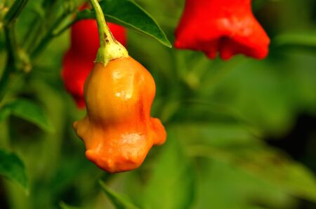 Ripened christmas bell chili peppers also known as bishop crown or Joker hat.