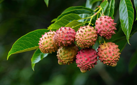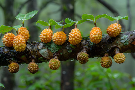 Exotic spiky yellow fruits are attached to a tree branch in a lush tropical forest. the vibrant colors and unique textures of the fruits stand out against the green foliage. ideal for nature photography enthusiasts and botanical art lovers. Generative AI
