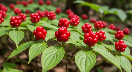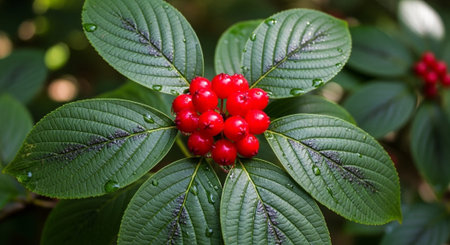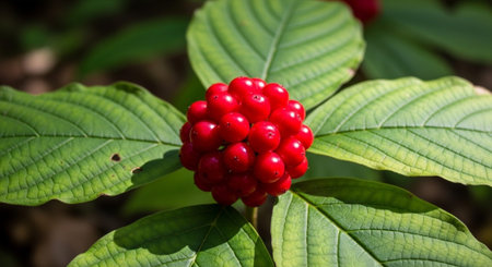 Vibrant red, textured, spherical berries clustered on a shrub with dark green, glossy leaves, captured in a detailed close up within a dense, shaded forest environment.