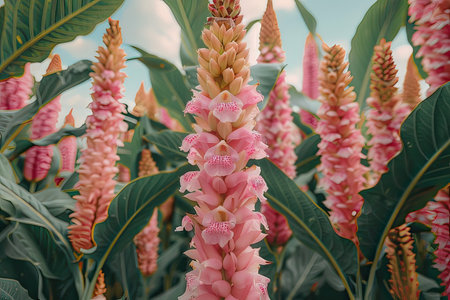 Shrimp plant swaying gently in the wind, realistic photography style, bright and vivid colors, natural lighting, detailed textures on the leaves, soft motion blur to suggest wind movement, ultra realistic, high resolution, cinematic atmosphere.