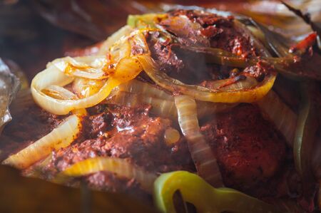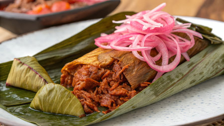Cochinita pibil tacos in banana leaves with habanero peppers. traditional mexican food