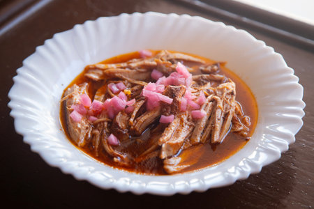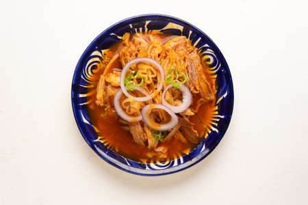 Cochinita pibil. Typical Mexican stew from Merida, Yucatan, made from pork marinated with achiote and generally accompanied with beans and red onion with habanero chili, it can be eaten in tacos.