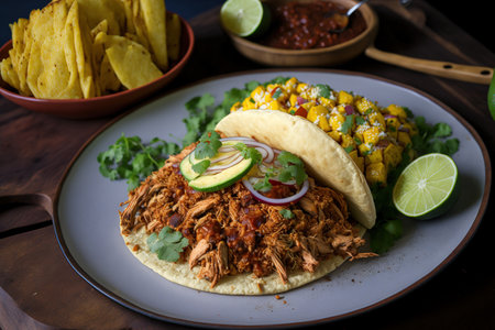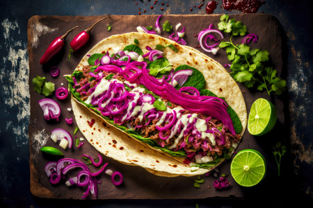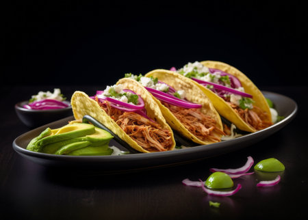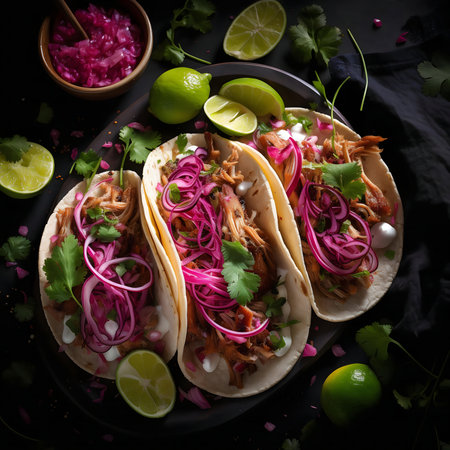Delight in this vibrant taco arrangement showcasing fresh ingredients on an artistically designed plate, perfect for conveying culinary culture and flavor.
