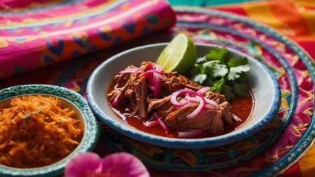 Cochinita Pibil, Mexican pit-roasted pork dish from Yucatan peninsula, served with rice, beans and traditional condiments. Tacos from Mexico.