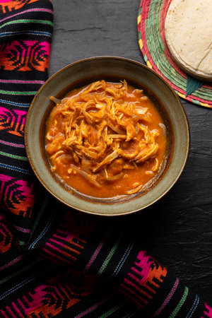 Traditional mexican chicken tinga with chipotle sauce on dark background