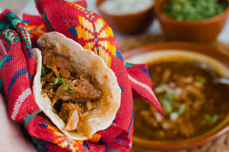 Taco of birria close-up. This taco is typical from Jalisco, Mexico, is spicy and it is usually eaten with mexican style beef stew