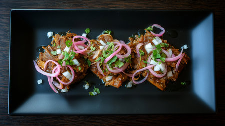 Carnitas tacos with red onion and raw salsa verde. Mexican slow cooked pork dish isolated on black plate