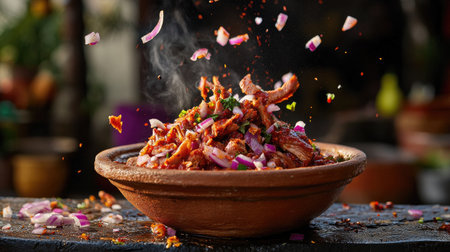 A dramatic levitation shot of Mexican Tacos de Cochinita Pibil with onions and habanero chili falling onto a clay dish, showcasing the vibrant ingredients in motion.