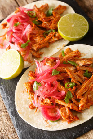 Cochinita pibil also puerco pibil or cochinita con achiote is a traditional Mexican slow-roasted pork dish from the Yucatan closeup in the slate board on the table. Vertical