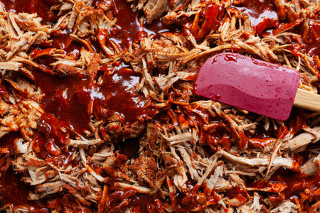 Homemade pulled pork with red silicone spatula and barbecue sauce on top of it, top view