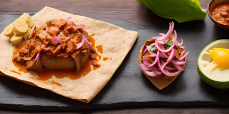Cochinita pibil with habanero pepper and purple onion. traditional mexican food