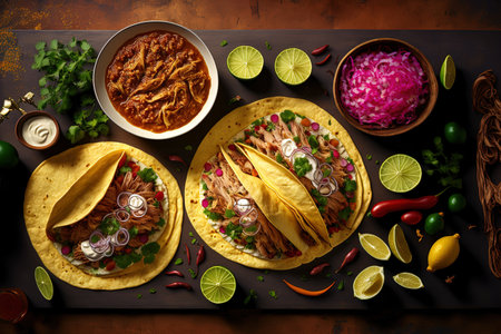 Traditional Mexican foods include pig carnitas cochinita pibil onion and habanero chile in this flat lay composition of tacos