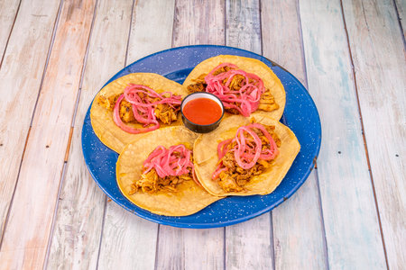 four Mexican corn tortilla tacos with a recipe for a cochinita pibil stew with red onion and dip sauce on a blue enameled plate