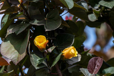 Thespesia populnea flower yellow blooming branch hanging on tree in the sea shore closeup.