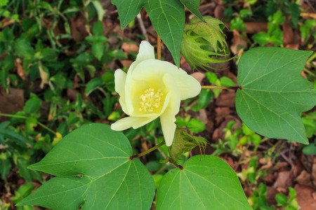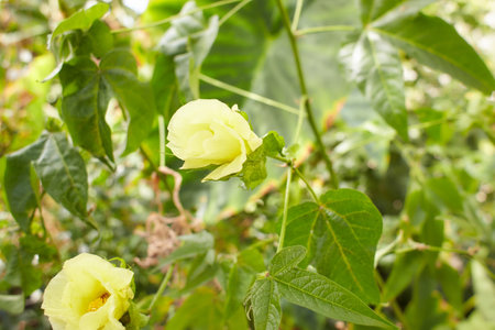 Yellow flowers of cotton gossypium barbadense in the garden. Summer and spring time