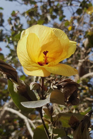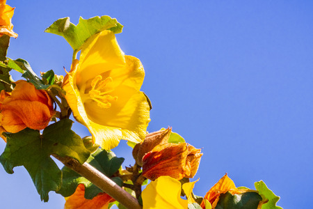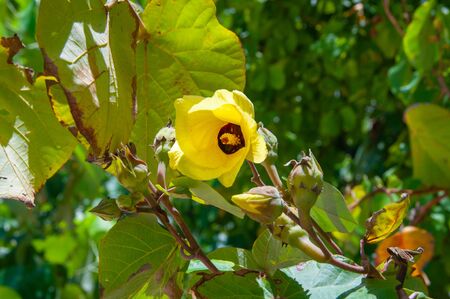 Tree cotton, Gossypium barbadense, in bloom with yellow flowers in spring